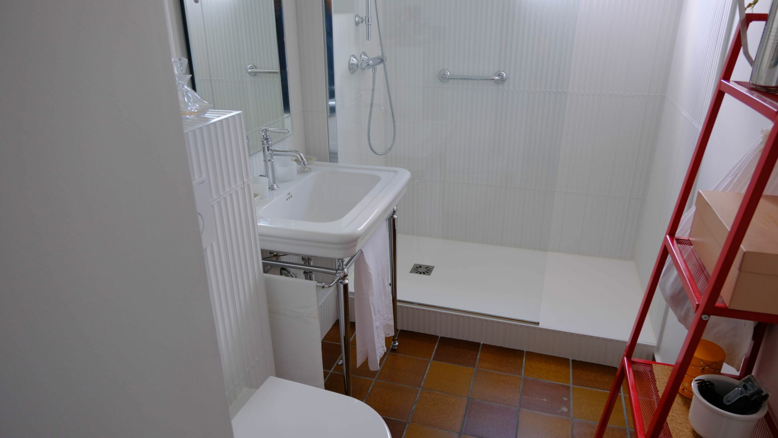 Cette salle de bain a été conçue dans un esprit Art Déco revisité, où chaque détail dialogue avec la lumière et les lignes architecturales du lieu. Le plan d’aménagement met en valeur une douche à l’italienne ouverte, pensée pour offrir confort et simplicité d’usage tout en préservant la pureté visuelle de l’espace.